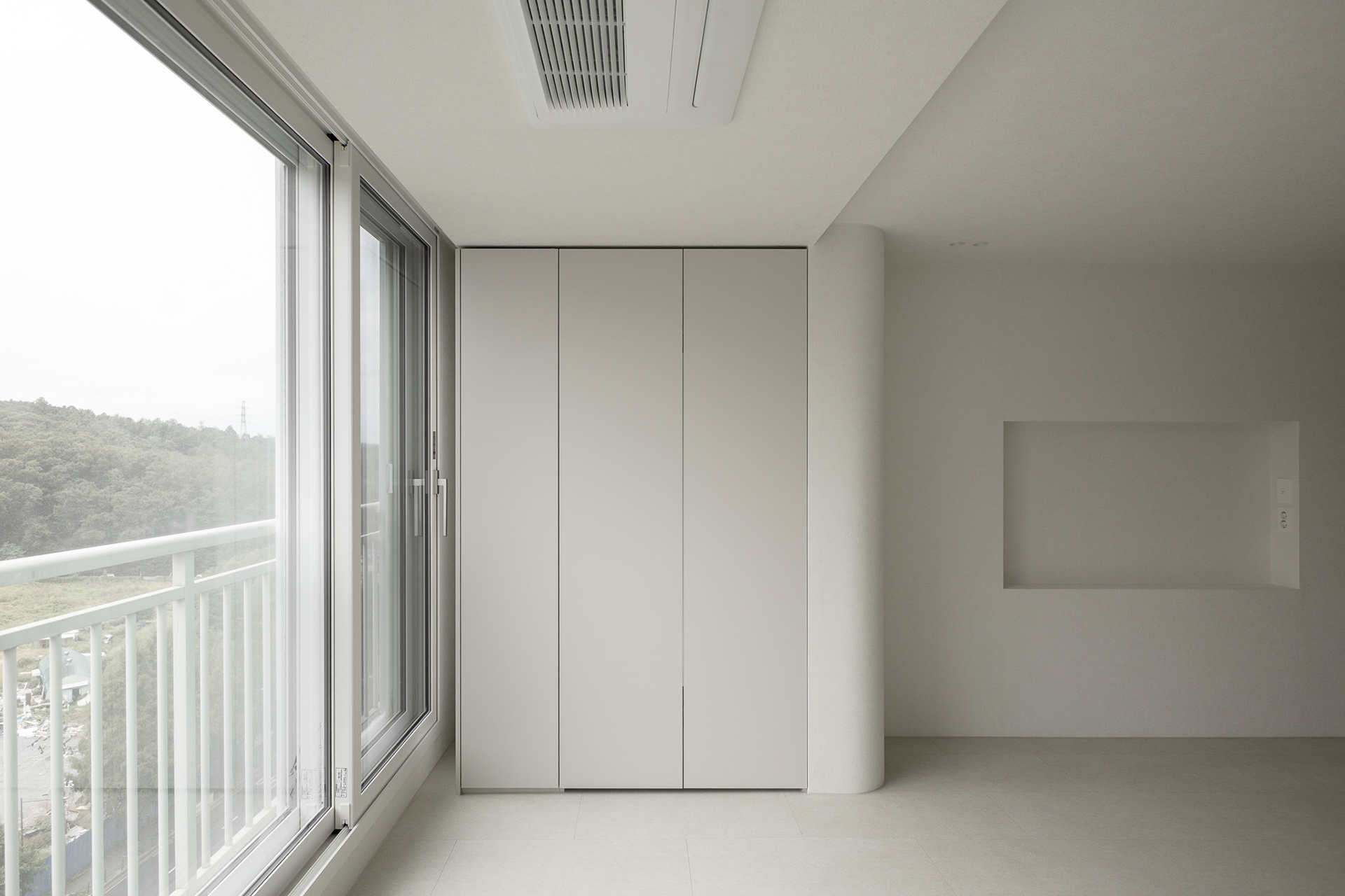 가장 심혈을 기울인 공간은 가족의 식사와 소통이 이루어지는 주방입니다. 구축 아파트가 가진 주방 구조의 물리적 한계를 억지로 거스르기보다, 지혜롭게 순응하며 그 안에서 최상의 효율을 찾아내는 데 주력했습니다. 불필요한 동선을 최소화하는 레이아웃 설계와 더불어, 가전과 수납이 벽면과 일체화되도록 가구 디자인을 정교하게 다듬었습니다. 이는 단순히 깔끔해 보이는 것을 넘어, 사용자의 손길이 닿는 모든 과정이 물 흐르듯 자연스럽게 이어지도록 의도한 결과입니다. 정갈하게 정리된 선과 면은 시각적인 피로도를 낮추고, 공간을 실제보다 훨씬 넓고 쾌적하게 보이게 합니다.