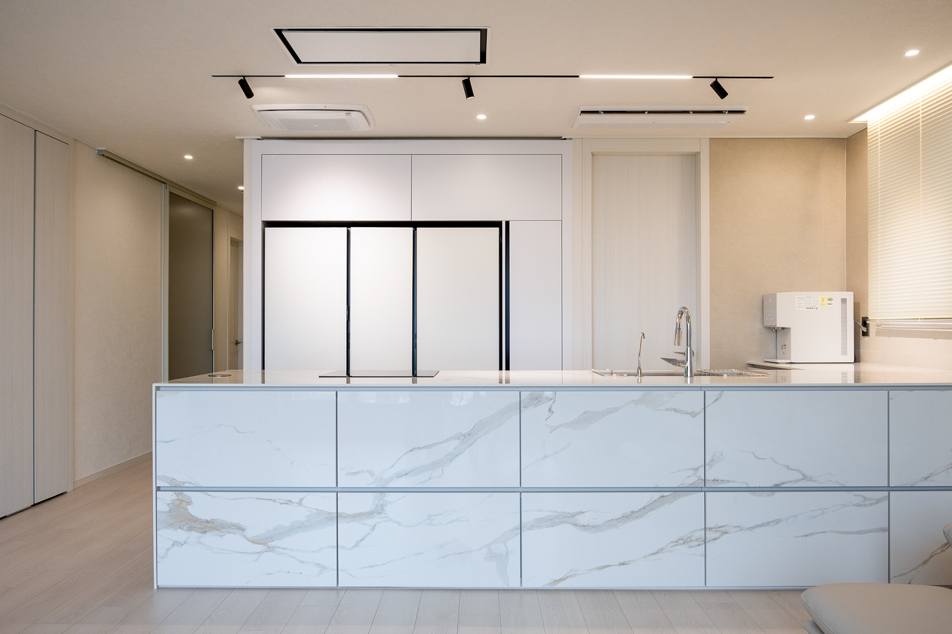 공간의 바탕은 무엇보다 정갈하고 우아합니다. 깨끗한 화이트 톤의 벽체가 만들어내는 차분한 베이스는 집안 전체를 부드럽게 아우르며 시각적인 편안함을 선사합니다. 이 고요한 캔버스 위에서 단연 돋보이는 주인공은 바로 주방의 대면형 아일랜드입니다. 고급스러움이 흐르는 '칼라카타 오로(Calacatta Oro)' 패턴의 세라믹을 적용하여, 마치 하나의 예술 작품처럼 공간의 중심을 묵직하게 잡아줍니다.