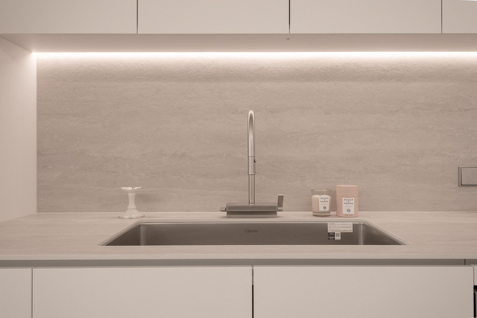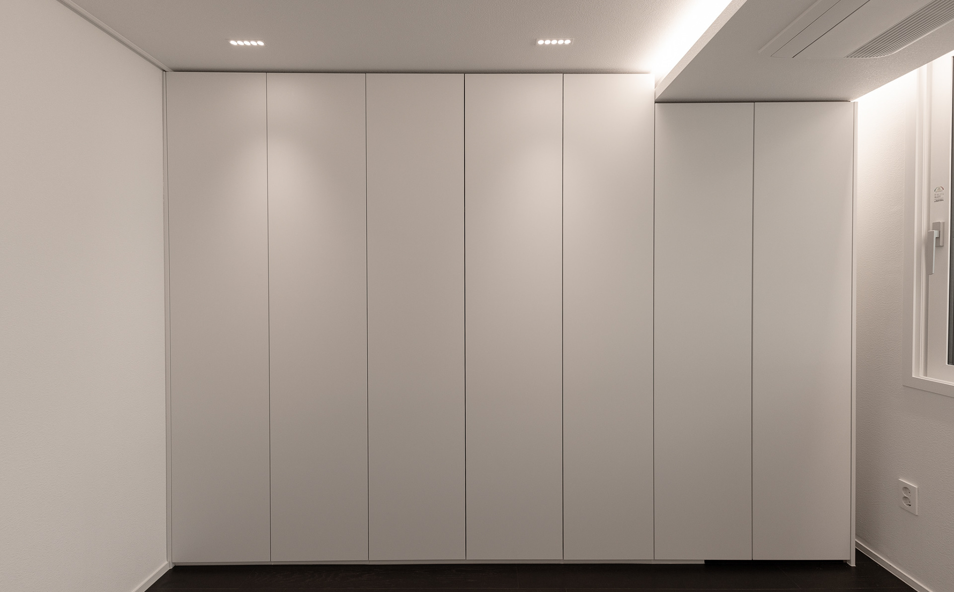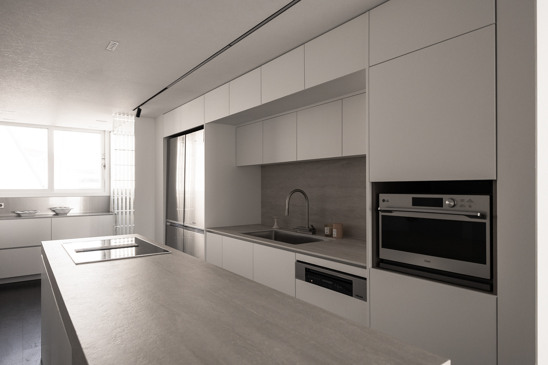 가장 많은 고민이 담긴 주방은 기존의 협소한 구조적 한계를 극복한 결과물입니다. 제한된 면적 안에서도 고객님의 가장 큰 로망이었던 아일랜드를 포기하지 않고, 동선에 무리를 주지 않는 최적의 크기로 설계했습니다. 특히, 식사를 마친 후에는 의자를 아일랜드 하부로 완전히 밀어 넣을 수 있도록 디테일을 정교하게 풀어내어, 좁은 주방이 언제나 정돈되고 넓어 보일 수 있도록 실용성을 극대화했습니다.