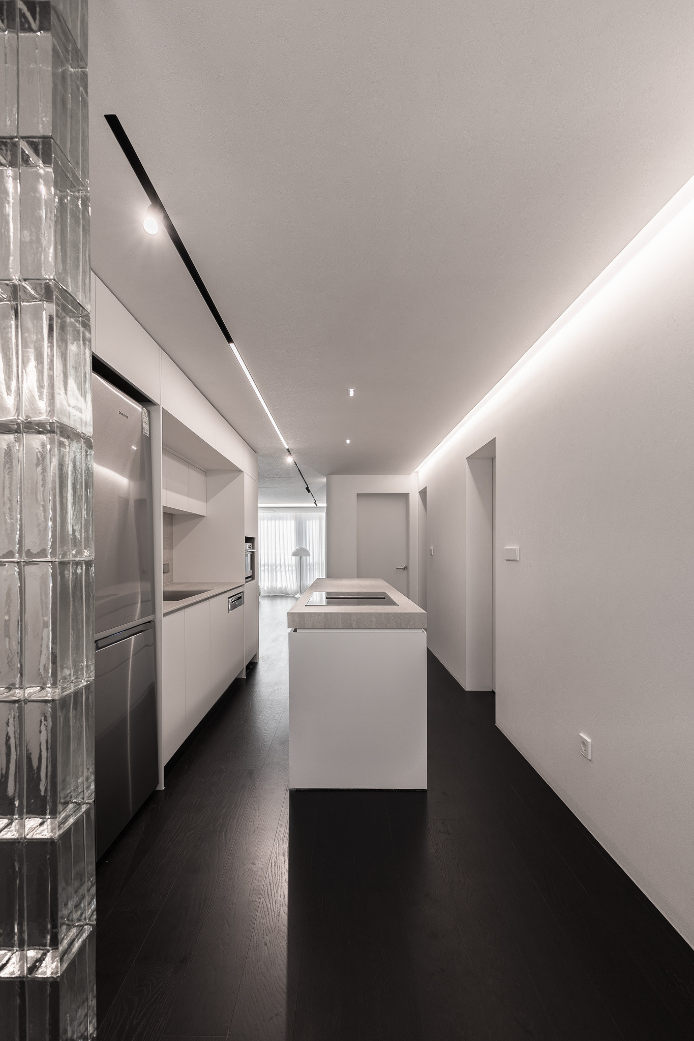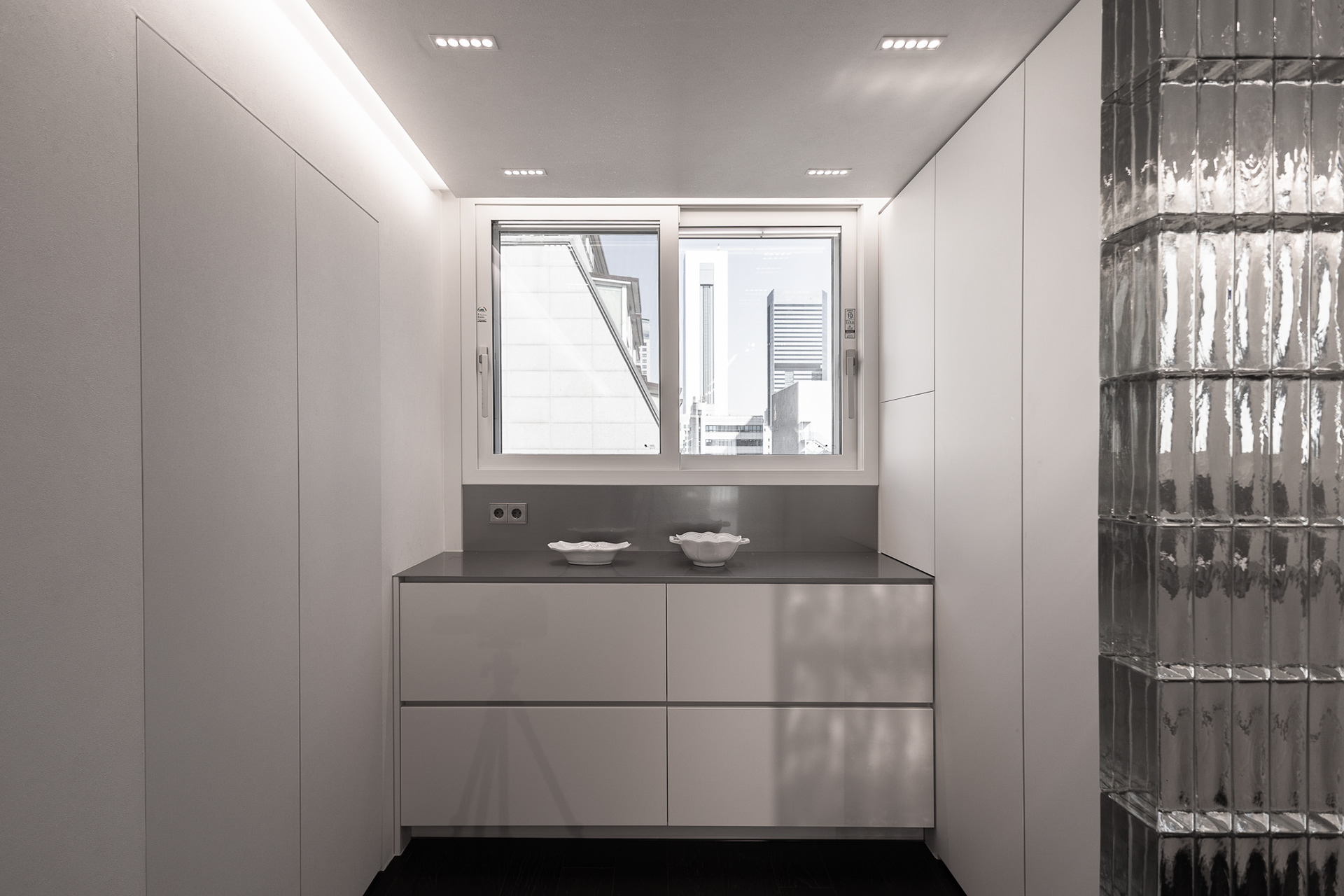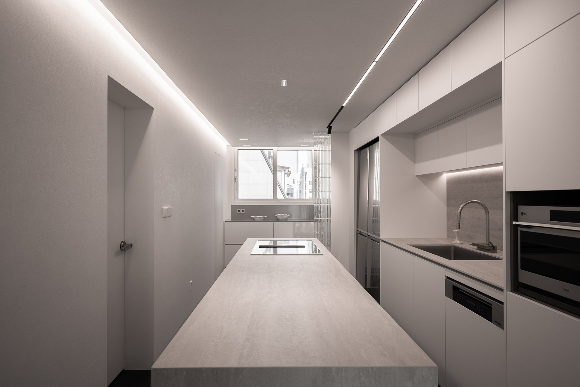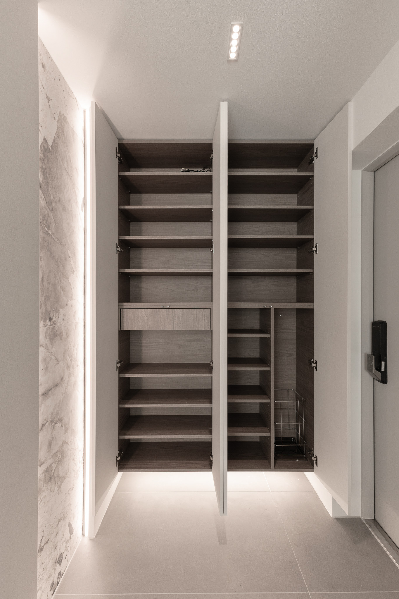가장 많은 고민이 담긴 주방은 기존의 협소한 구조적 한계를 극복한 결과물입니다. 제한된 면적 안에서도 고객님의 가장 큰 로망이었던 아일랜드를 포기하지 않고, 동선에 무리를 주지 않는 최적의 크기로 설계했습니다. 특히, 식사를 마친 후에는 의자를 아일랜드 하부로 완전히 밀어 넣을 수 있도록 디테일을 정교하게 풀어내어, 좁은 주방이 언제나 정돈되고 넓어 보일 수 있도록 실용성을 극대화했습니다.
