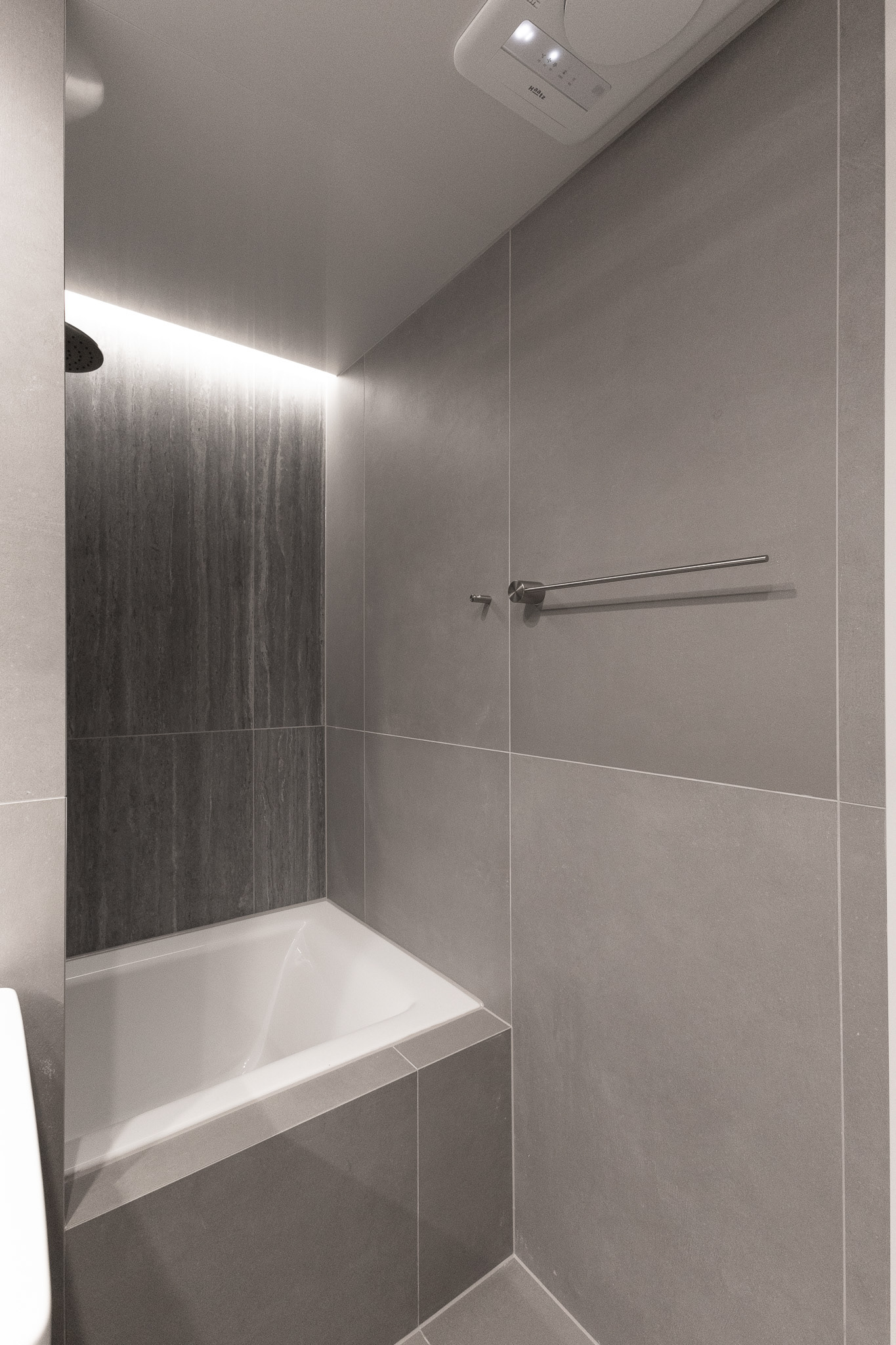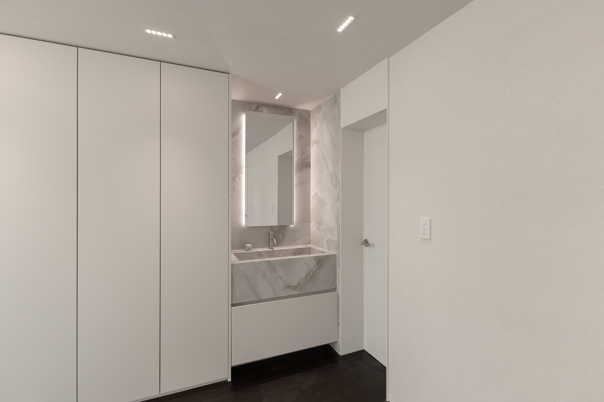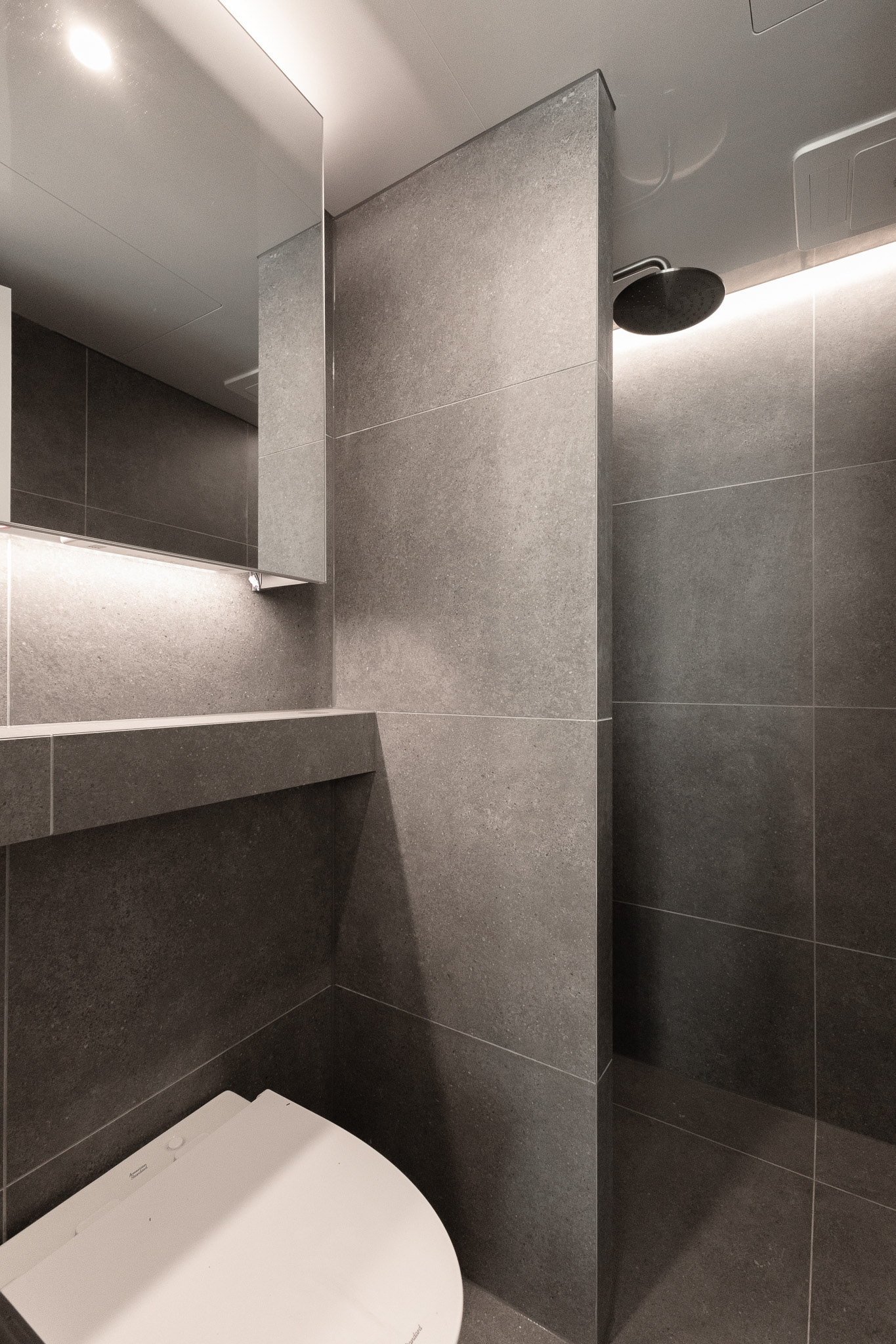 이번 현장의 구조적 묘미는 욕실에서 한 번 더 빛을 발합니다. 비좁았던 안방 화장실의 한계를 극복하기 위해 세면대를 침실 공간으로 과감히 꺼내어, 마치 고급 호텔과 같은 세련된 건식 세면대를 조성했습니다. 세면대가 비워지며 한결 여유로워진 욕실 내부에는 쾌적한 독립 샤워 공간을 새롭게 마련했습니다. 또한, 모든 화장실에는 600x1200각의 큼직한 대형 타일을 시공하여 시선을 확장시키고, 공간이 좁아 보이지 않도록 했습니다.