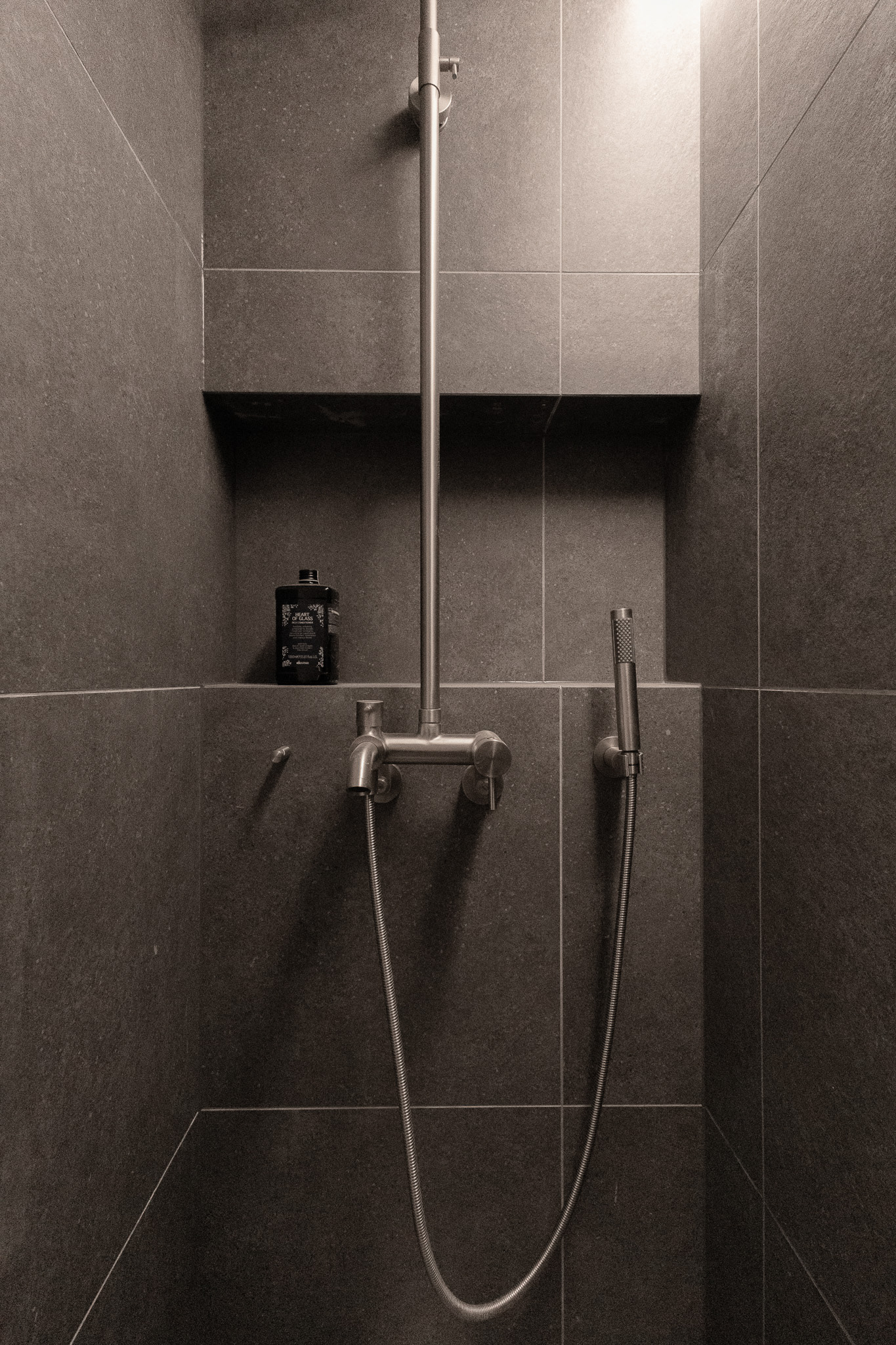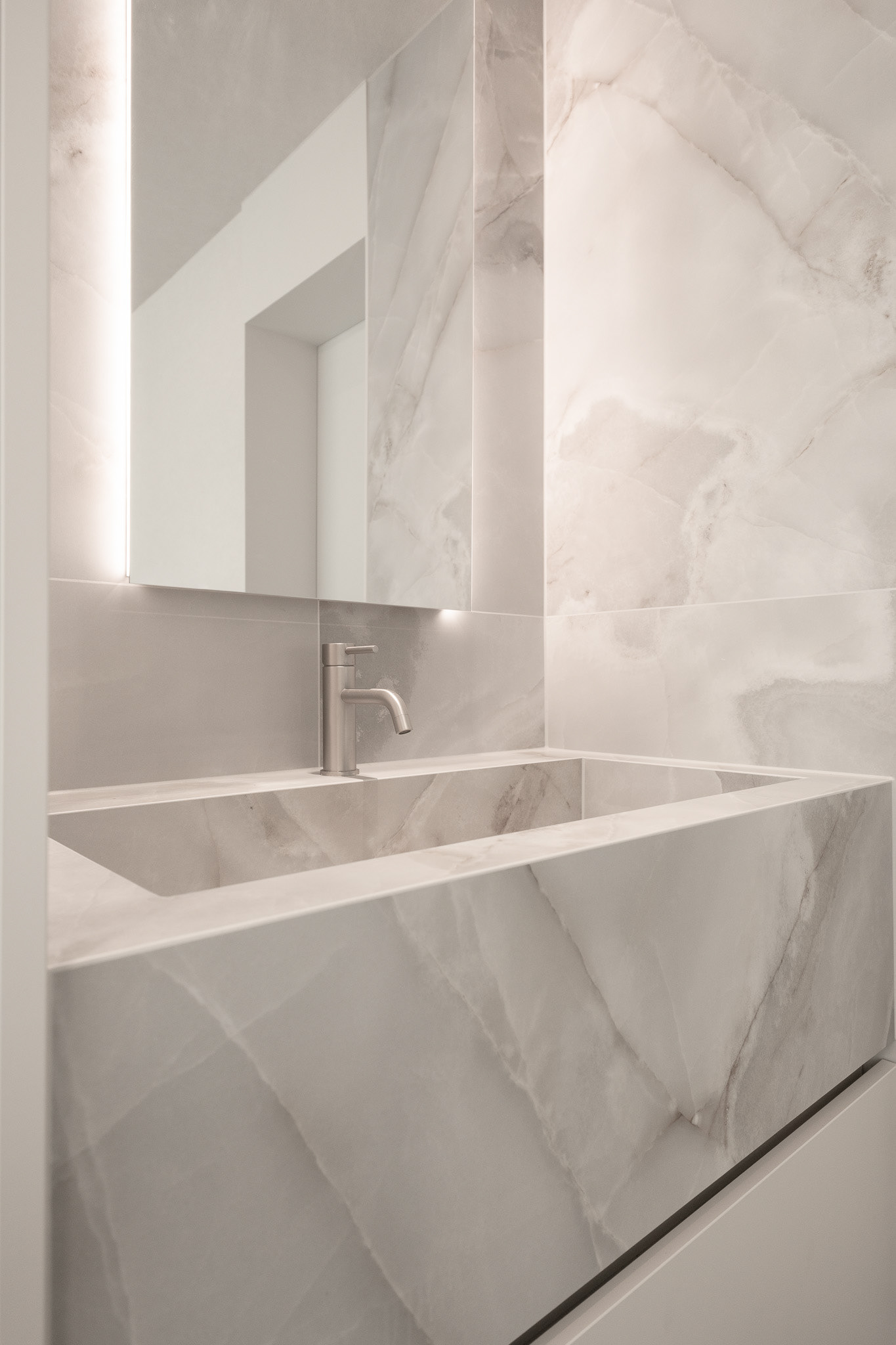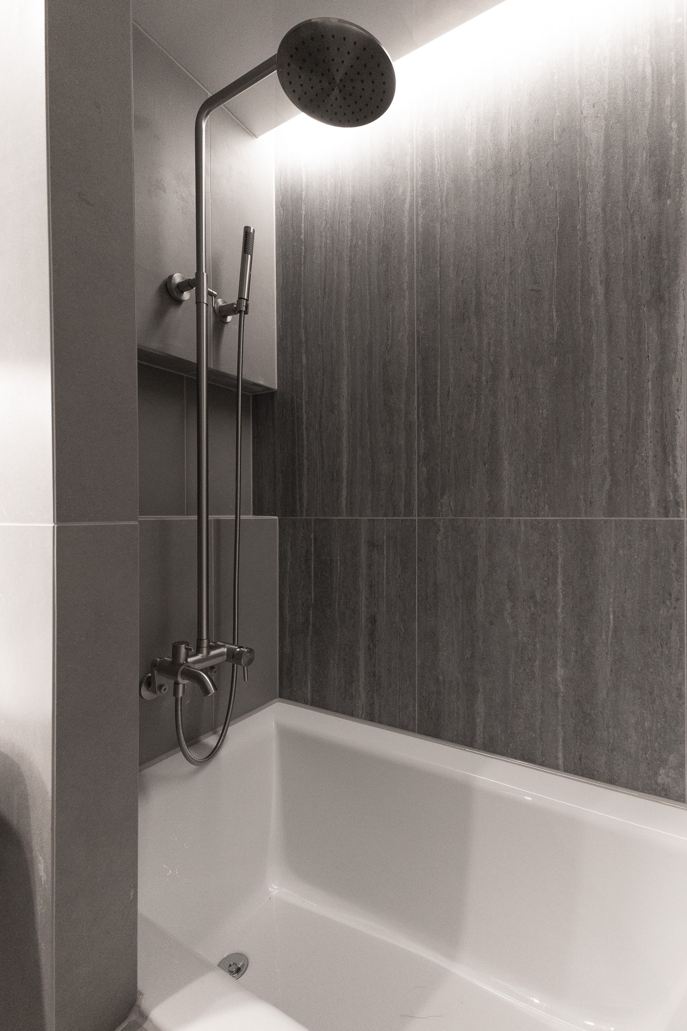 이번 현장의 구조적 묘미는 욕실에서 한 번 더 빛을 발합니다. 비좁았던 안방 화장실의 한계를 극복하기 위해 세면대를 침실 공간으로 과감히 꺼내어, 마치 고급 호텔과 같은 세련된 건식 세면대를 조성했습니다. 세면대가 비워지며 한결 여유로워진 욕실 내부에는 쾌적한 독립 샤워 공간을 새롭게 마련했습니다. 또한, 모든 화장실에는 600x1200각의 큼직한 대형 타일을 시공하여 시선을 확장시키고, 공간이 좁아 보이지 않도록 했습니다.